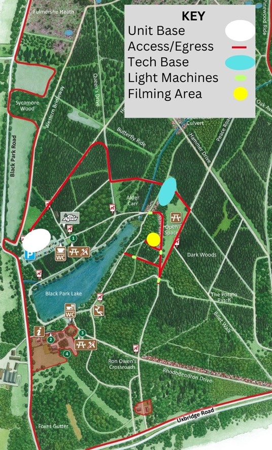 There will be a very large film unit in Black Park Country Park from Monday 8th to Friday 12th December. The filming will actually take place on Wednesday and will involve a car driving, smoke effects, a drone, a lighting crane and stunt sequence including sensitive content. You may be asked to hold whilst filming takes place or offered a diversion route. The park will be busier than usual on Wednesday and Thursday with equipment, machinery and crew members.
